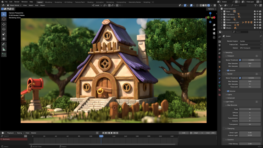During the texturing segment, you will explore two primary methods for painting textures. Additionally, you will gain proficiency in scattering elements using basic Geometry Nodes, creating stylized smoke with a basic Particle system, and producing a final render with Blender’s Cycles render engine